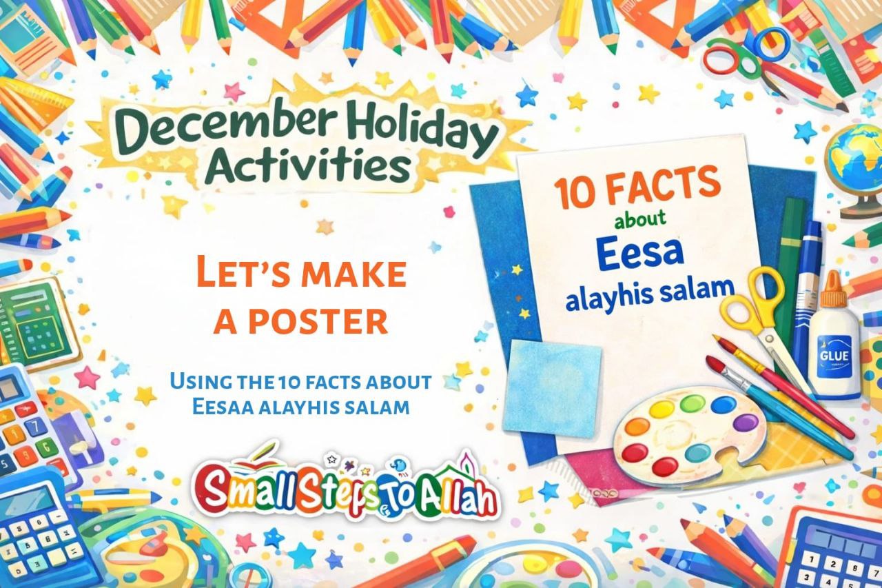 Let’s learn 10 facts about Sayyiduna Eesa alayhis salam and make a poster! Use the bold text for your poster. The text in brackets is to explain the bold text. Remember to learn, get creative and have fun too!